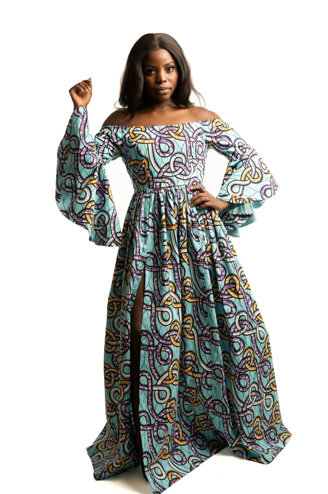 Strapless flared long sleeve maxi dress.